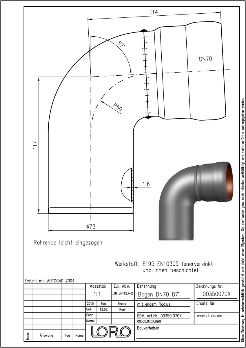 LORO-X Bogen mit engem Radius, aus Stahl, feuerverzinkt, nach DIN EN 1123 mit erhöhtem Qualitätsstandard gemäß RAL-Gütezeichen GZ-694, mit 2-Kammern-Steckmuffenverbindung, Baustoffklasse A1, formstabil, bruchfest, rückstausicher, langlebige Innenbeschichtung gemäß DIN EN ISO 2178 auf Basis einer 2K-Epoxid-Kombination, Farbton: Rotbraun, 87 Grad, DN 70