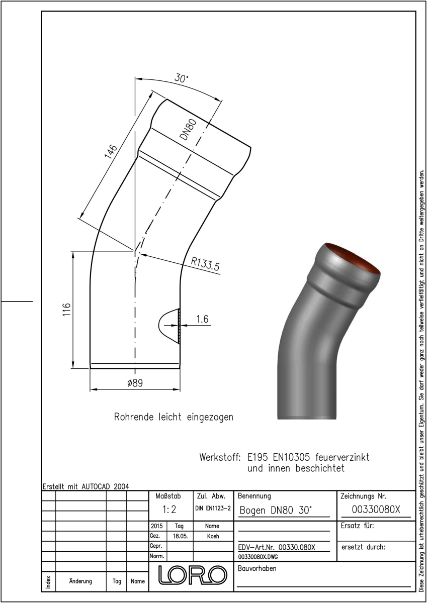 LORO-X Bogen, aus Stahl, feuerverzinkt, nach DIN EN 1123 mit erhöhtem Qualitätsstandard gemäß RAL-Gütezeichen GZ-694, mit 2-Kammern-Steckmuffenverbindung, Baustoffklasse A1, formstabil, bruchfest, rückstausicher, langlebige Innenbeschichtung gemäß DIN EN ISO 2178 auf Basis einer 2K-Epoxid-Kombination, Farbton: Rotbraun, 30 Grad, DN 80