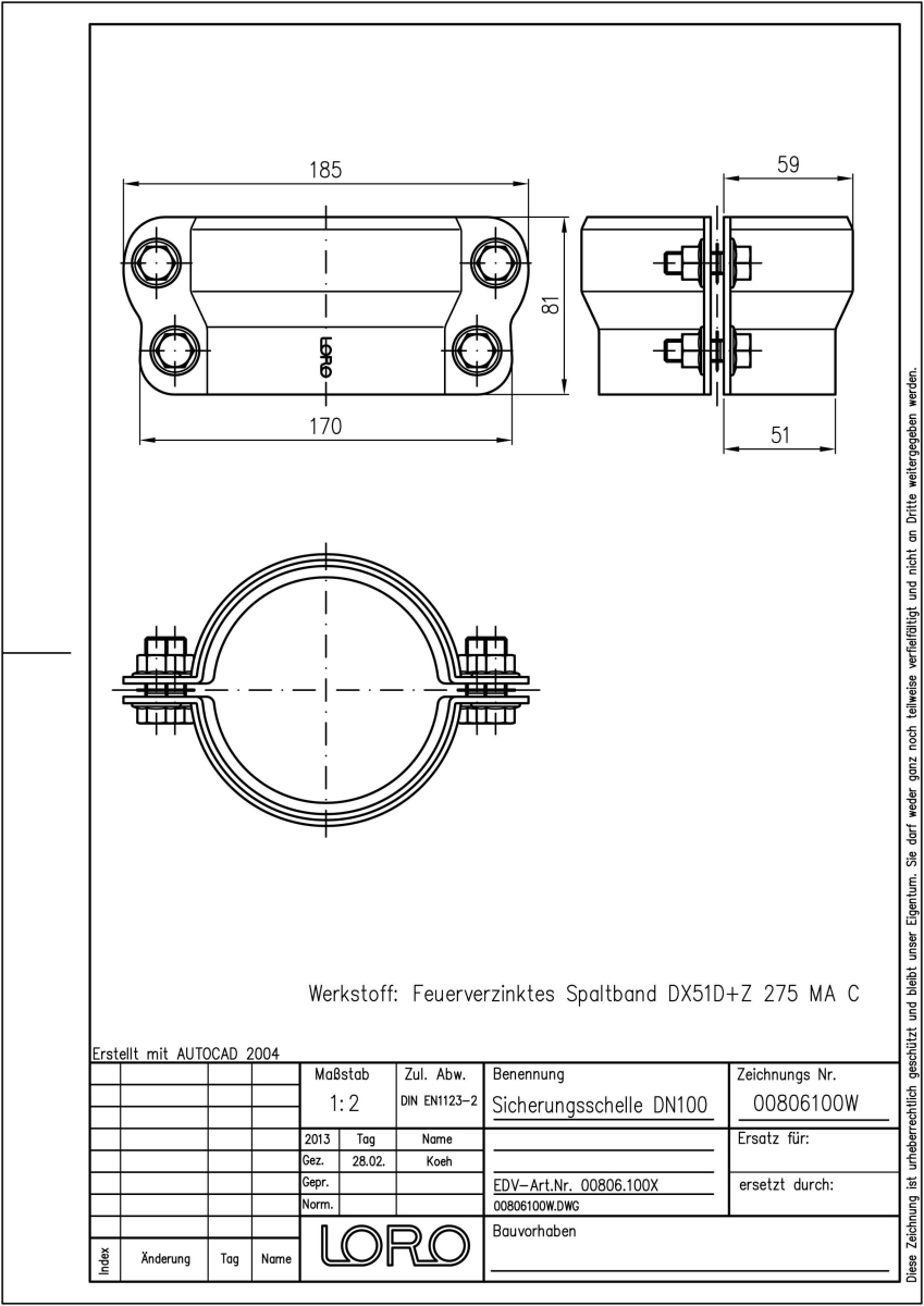 LORO-X Sicherungsschelle, aus Stahl, feuerverzinkt, nach DIN EN 1123, mit erhöhtem Qualitätsstandard gemäß RAL-Gütezeichen GZ-694, zur axialen Schubsicherung für druckbeaufschlagte Leitungen, DN 100