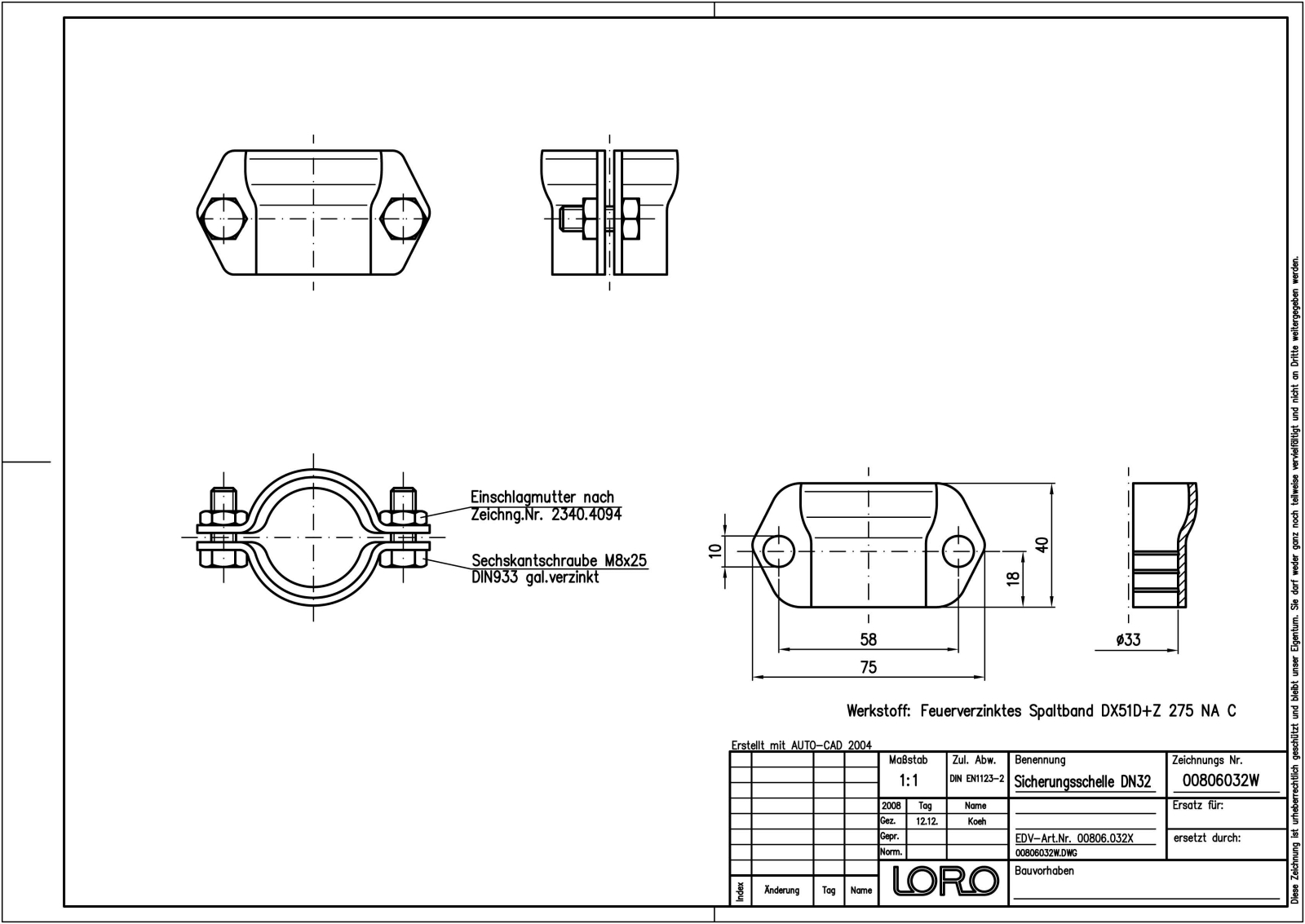 LORO-X Sicherungsschelle, aus Stahl, feuerverzinkt, nach DIN EN 1123, mit erhöhtem Qualitätsstandard gemäß RAL-Gütezeichen GZ-694, zur axialen Schubsicherung für druckbeaufschlagte Leitungen, DN 32