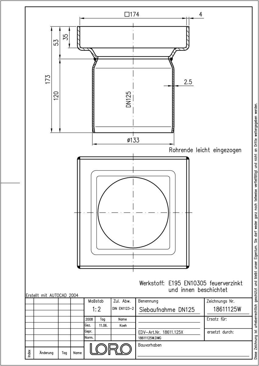 LORO-Siebaufnahme, aus Stahl, feuerverzinkt , langlebige Innenbeschichtung gemäß DIN EN ISO 2178 auf Basis einer 2K-Epoxid-Kombination, Farbton: Rotbraun, 182 x 182 mm, für Aufbauhöhe 40 - 75 mm, DN 125