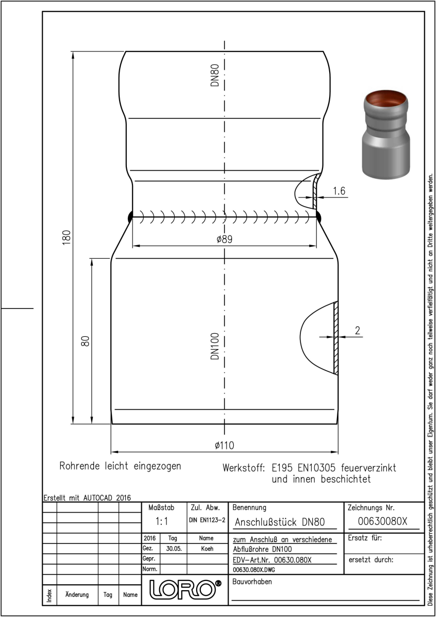 LORO-X Anschlussstück aus Stahl, feuerverzinkt, von LORO-X Rohr DN 80 an SML-Rohr DN 100 und Kunststoffrohrmuffe DN 100, nach DIN EN 1123 mit erhöhtem Qualitätsstandard gemäß RAL-Gütezeichen GZ-694, mit 2-Kammern-Steckmuffenverbindung, Baustoffklasse A1, formstabil, bruchfest, rückstausicher, langlebige Innenbeschichtung gemäß DIN EN ISO 2178 auf Basis einer 2K-Epoxid-Kombination, Farbton: Rotbraun, DN 80/100