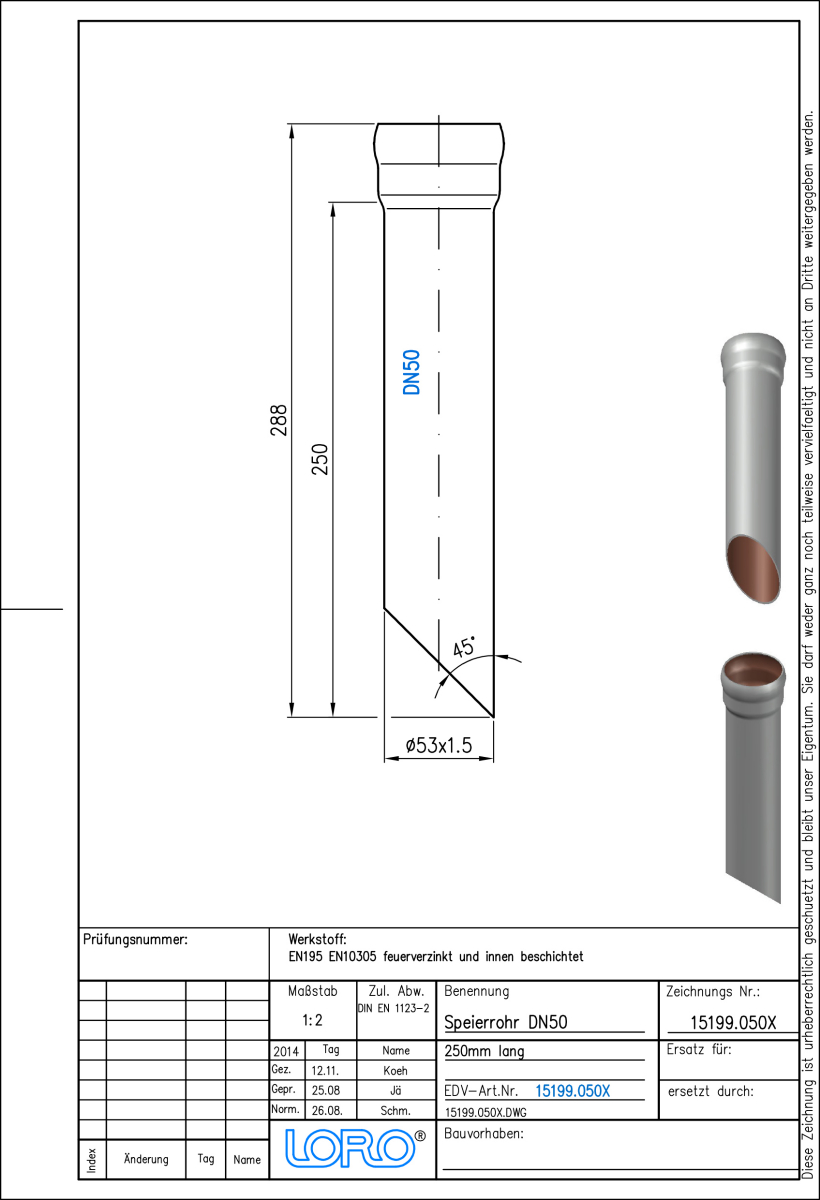 LORO-X Speierrohr, aus Stahl, feuerverzinkt, nach DIN EN 1123, mit erhöhtem Qualitätsstandard gemäß RAL-Gütezeichen GZ-694, mit 2-Kammern-Steckmuffenverbindung (1 Muffe), langlebige Innenbeschichtung gemäß DIN EN ISO 2178 auf Basis einer 2K-Epoxid-Kombination, Farbton: Rotbraun, 250 mm, DN 50