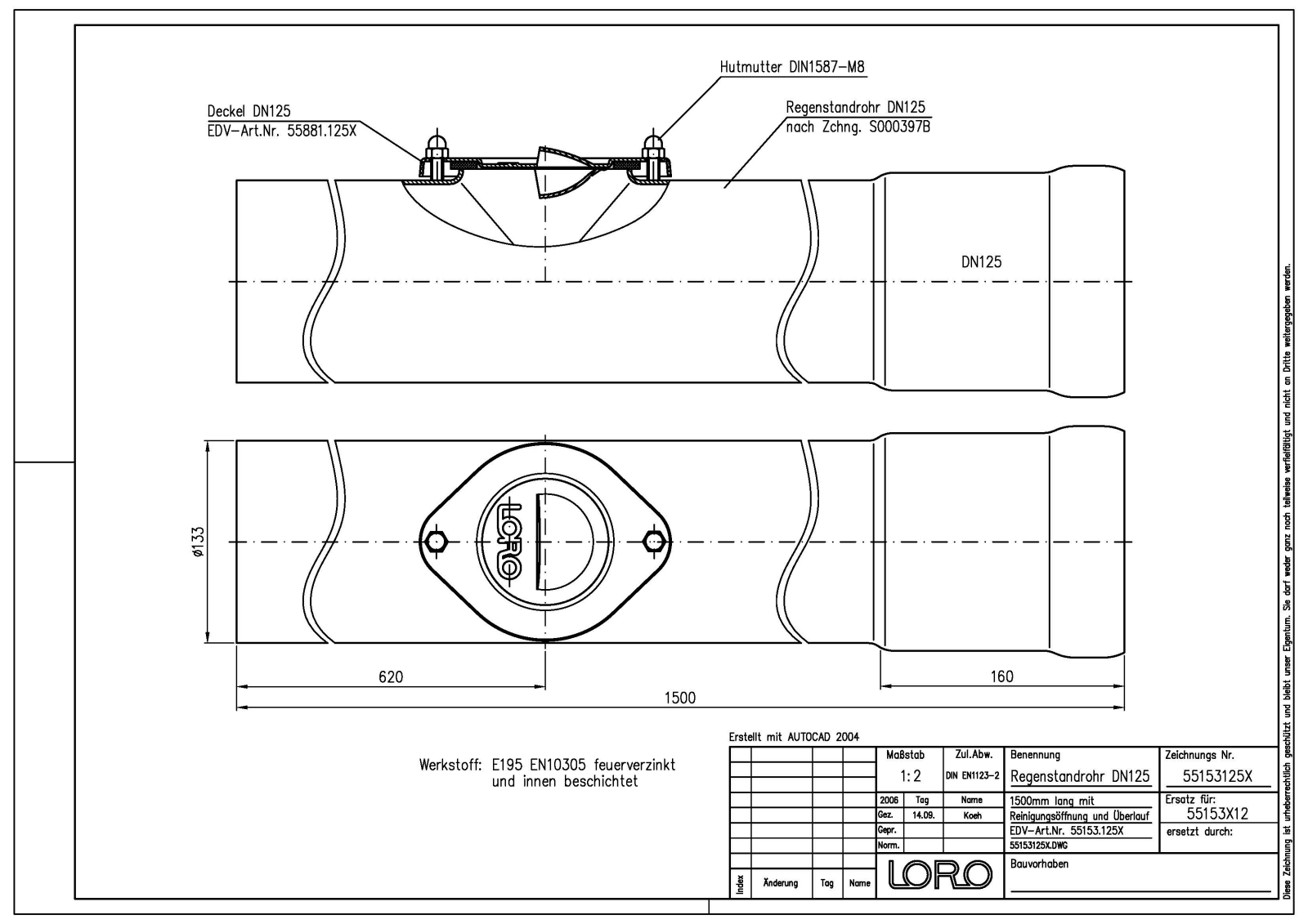 LORO-X Regenstandrohr, aus Stahl, feuerverzinkt, rund, mit Reinigungsöffnung und Reinigungsdeckel mit Sicherheitsüberlauf, nach DIN EN 1123, mit erhöhtem Qualitätsstandard gemäß RAL-Gütezeichen GZ-694, mit 2-Kammern-Steckmuffenverbindung, Baustoffklasse A1, formstabil, bruchfest, rückstausicher, langlebige Innenbeschichtung gemäß DIN EN ISO 2178 auf Basis einer 2K-Epoxid-Kombination, Farbton: Rotbraun, 1500 mm DN 125