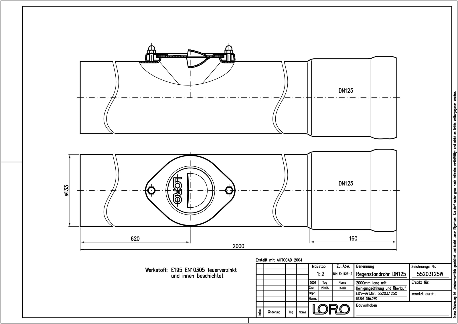 LORO-X Regenstandrohr, aus Stahl, feuerverzinkt, rund, mit Reinigungsöffnung und Reinigungsdeckel mit Sicherheitsüberlauf, nach DIN EN 1123, mit erhöhtem Qualitätsstandard gemäß RAL-Gütezeichen GZ-694, mit 2-Kammern-Steckmuffenverbindung, Baustoffklasse A1, formstabil, bruchfest, rückstausicher, langlebige Innenbeschichtung gemäß DIN EN ISO 2178 auf Basis einer 2K-Epoxid-Kombination, Farbton: Rotbraun, 2000 mm DN 125