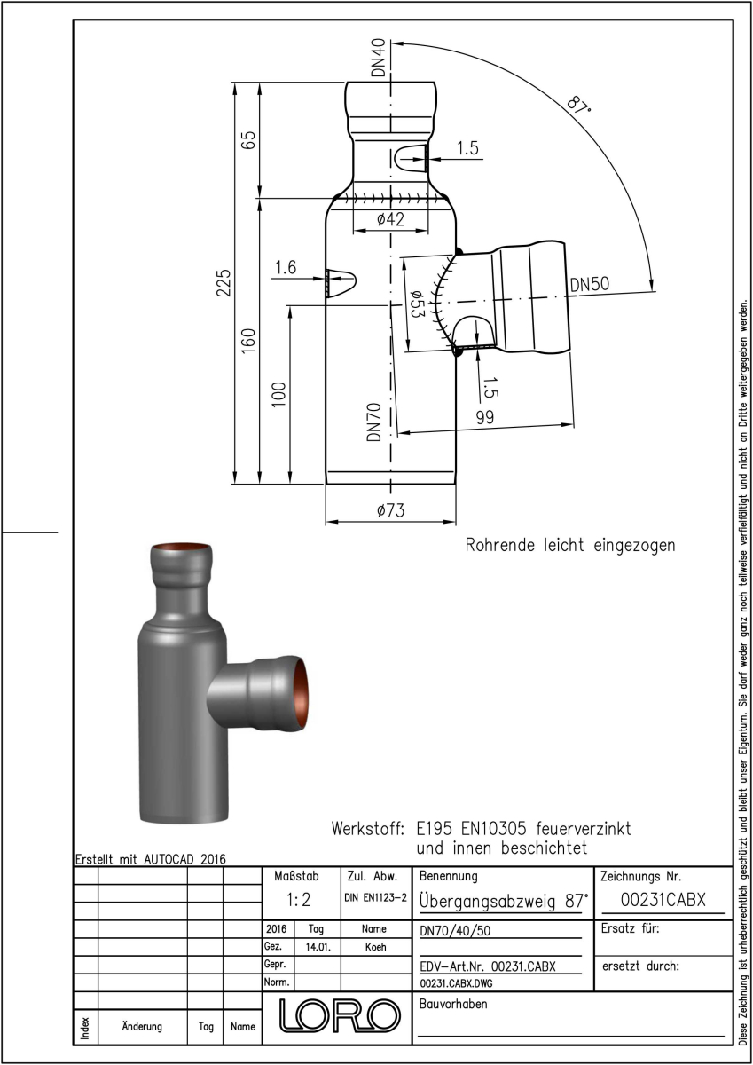 LORO-X Übergangsabzweig, aus Stahl, feuerverzinkt, nach DIN EN 1123, mit erhöhtem Qualitätsstandard gemäß RAL-Gütezeichen GZ-694, mit 2-Kammern-Steckmuffenverbindung, Baustoffklasse A1, formstabil, bruchfest, rückstausicher, langlebige Innenbeschichtung gemäß DIN EN ISO 2178 auf Basis einer 2K-Epoxid-Kombination, Farbton: Rotbraun, 87 Grad, DN 70/40/50