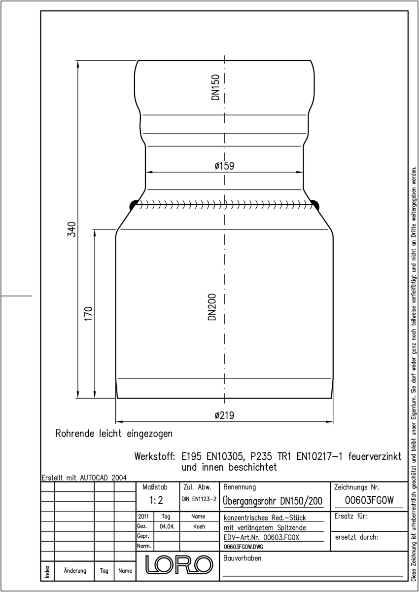 LORO-X Übergangsrohr, aus Stahl, feuerverzinkt, konzentrisch, mit verlängertem Spitzende, passend für Sicherungsschelle Art.-Nr. 806X, nach DIN EN 1123 mit erhöhtem Qualitätsstandard gemäß RAL-Gütezeichen GZ-694, mit 2-Kammern-Steckmuffenverbindung, Baustoffklasse A1, formstabil, bruchfest, rückstausicher, langlebige Innenbeschichtung gemäß DIN EN ISO 2178 auf Basis einer 2K-Epoxid-Kombination, Farbton: Rotbraun, DN 150/200