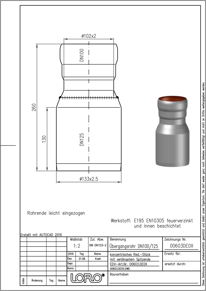 LORO-X Übergangsrohr, aus Stahl, feuerverzinkt, konzentrisch, mit verlängertem Spitzende, passend für Sicherungsschelle Art.-Nr. 806X, nach DIN EN 1123 mit erhöhtem Qualitätsstandard gemäß RAL-Gütezeichen GZ-694, mit 2-Kammern-Steckmuffenverbindung, Baustoffklasse A1, formstabil, bruchfest, rückstausicher, langlebige Innenbeschichtung gemäß DIN EN ISO 2178 auf Basis einer 2K-Epoxid-Kombination, Farbton: Rotbraun, DN 100/125