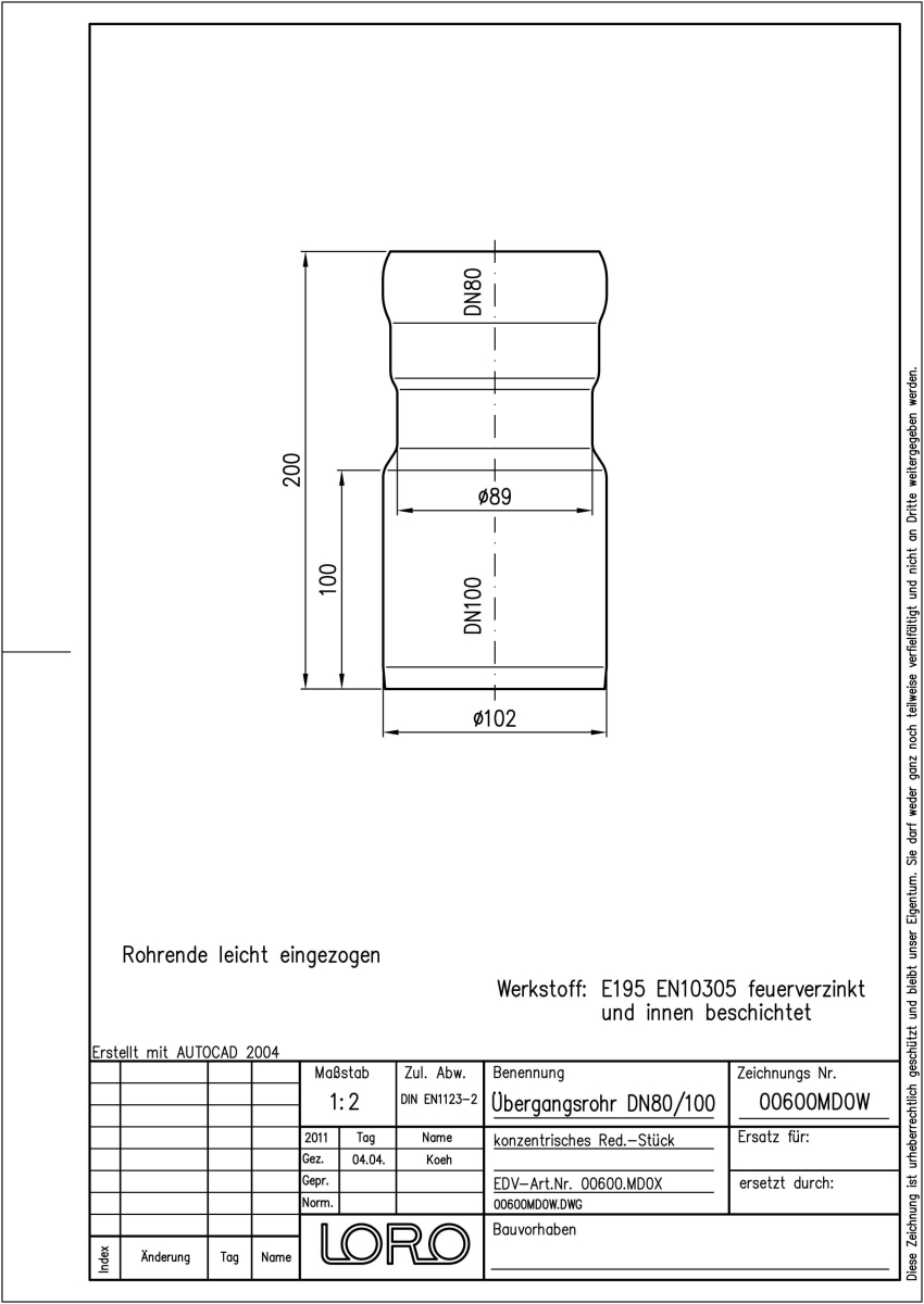 LORO-X Übergangsrohr, aus Stahl, feuerverzinkt, konzentrisch, nach DIN EN 1123 mit erhöhtem Qualitätsstandard gemäß RAL-Gütezeichen GZ-694, mit 2-Kammern-Steckmuffenverbindung, Baustoffklasse A1, formstabil, bruchfest, rückstausicher, langlebige Innenbeschichtung gemäß DIN EN ISO 2178 auf Basis einer 2K-Epoxid-Kombination, Farbton: Rotbraun, DN 80/100