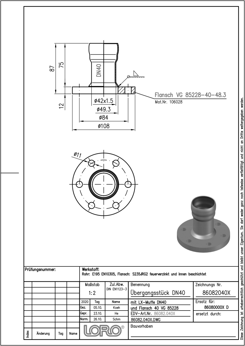 LORO-X Übergangsstück mit VG-Flansch 85228 und Steckmuffenverbindung