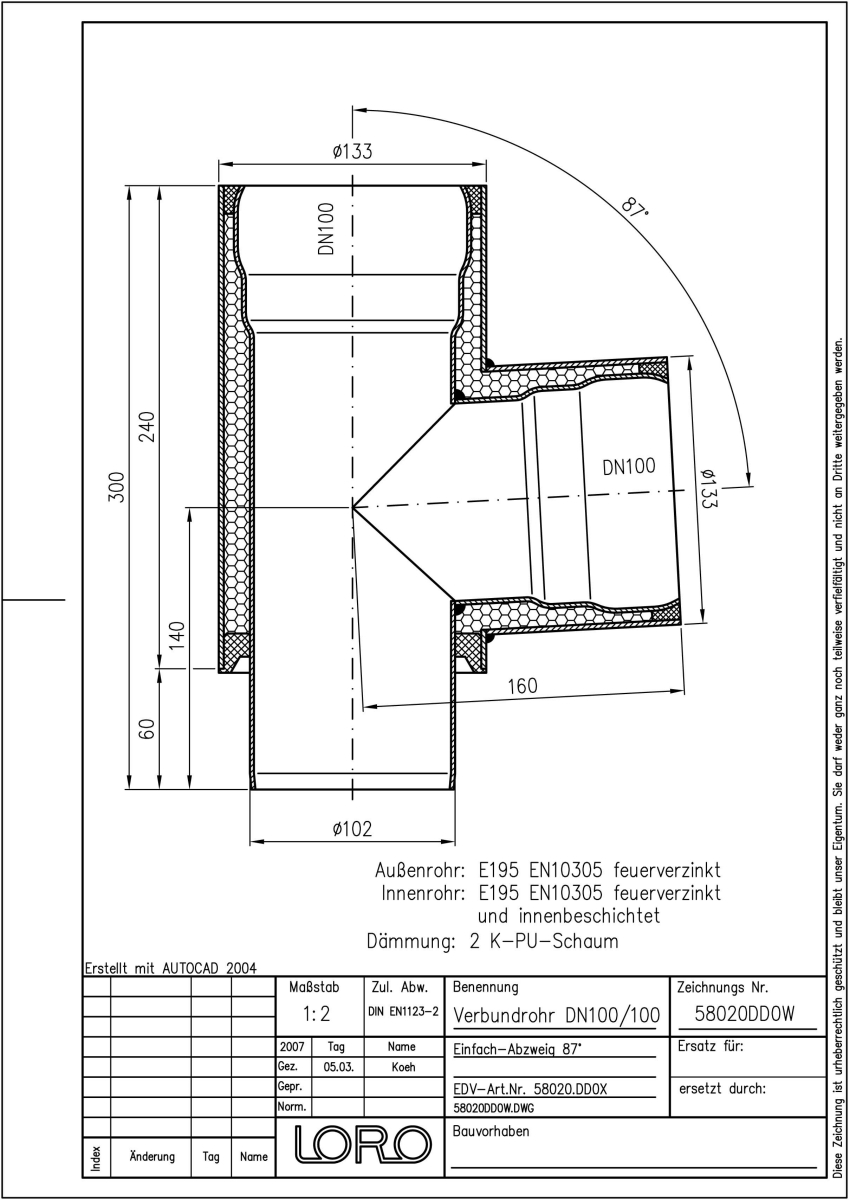LORO-X Verbundrohr-Abzweig, bestehend aus Innenrohr (LORO-X Rohr, aus Stahl feuerverzinkt, nach DIN EN 1123, mit erhöhtem Qualitätsstandard gemäß RAL-Gütezeichen GZ-694, mit 2-Kammern-Steckmuffenverbindung, Baustoffklasse A1, formstabil, bruchfest, rückstausicher, langlebige Innenbeschichtung gemäß DIN EN ISO 2178 auf Basis einer 2K-Epoxid-Kombination, Farbton: Rotbraun), Dämmschicht (PU-Hartschaum B2, FCKW-frei) und Außenrohr (LORO-X Rohr, aus Stahl, feuerverzinkt), 87 Grad, DN 100