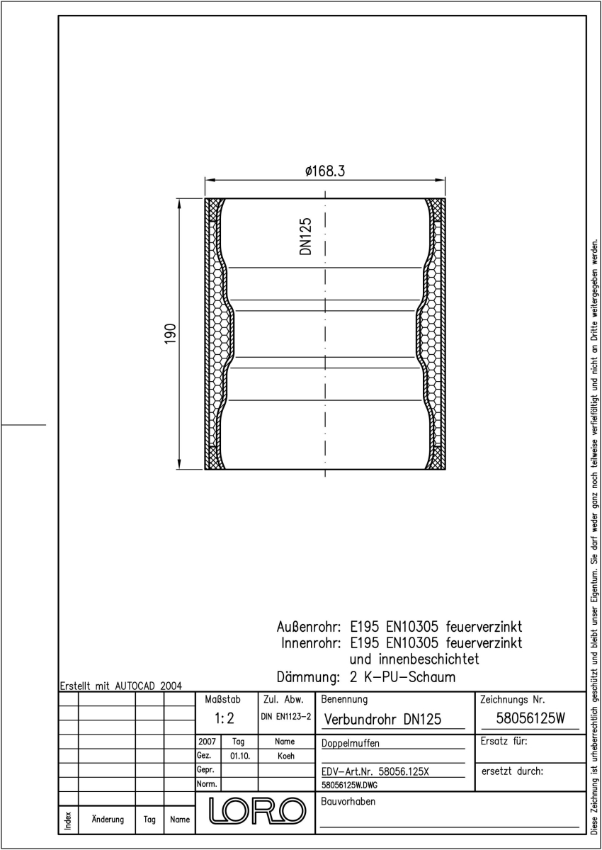 LORO-X Verbundrohr-Doppelmuffe (überstehend), bestehend aus Innenrohr (LORO-X Rohr, aus Stahl, feuerverzinkt, nach DIN EN 1123, mit erhöhtem Qualitätsstandard gemäß RAL-Gütezeichen GZ-694, mit 2-Kammern-Steckmuffenverbindung, Baustoffklasse A1, formstabil, bruchfest, rückstausicher, langlebige Innenbeschichtung gemäß DIN EN ISO 2178 auf Basis einer 2K-Epoxid-Kombination, Farbton: Rotbraun), Dämmschicht (PU-Hartschaum B2, FCKW-frei) und Außenrohr (LORO-X Rohr, feuerverzinkt), DN 125