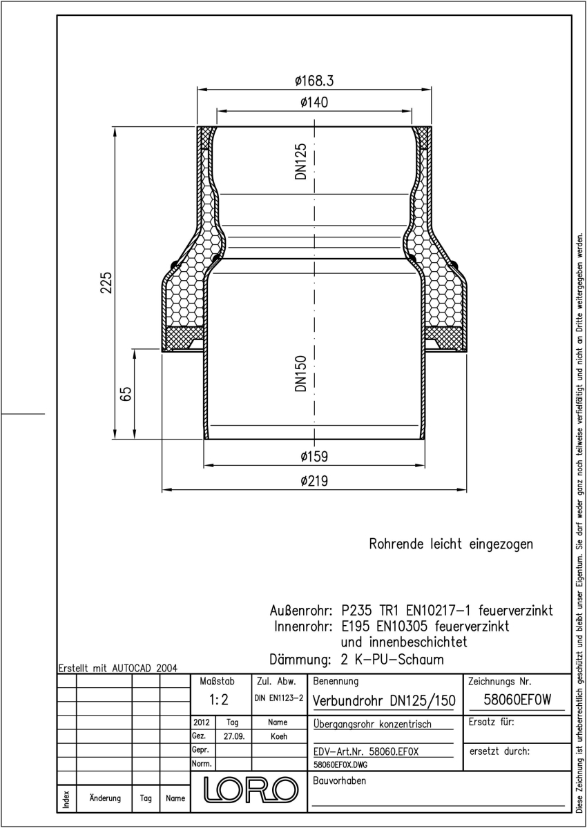 LORO-X Verbundrohr Übergangsrohr (konzentr. Red.-Stück) bestehend aus Innenrohr (LORO-X Rohr, aus Stahl, feuerverzinkt, nach DIN EN 1123, mit erhöhtem Qualitätsstandard gemäß RAL-Gütezeichen GZ-694, mit 2-Kammern-Steckmuffenverbindung, Baustoffklasse A1, formstabil, bruchfest, rückstausicher, langlebige Innenbeschichtung gemäß DIN EN ISO 2178 auf Basis einer 2K-Epoxid-Kombination, Farbton: Rotbraun), Dämmschicht (PU-Hartschaum B2, FCKW-frei) und Außenrohr (LORO-X Rohr, feuerverzinkt), DN 125/150