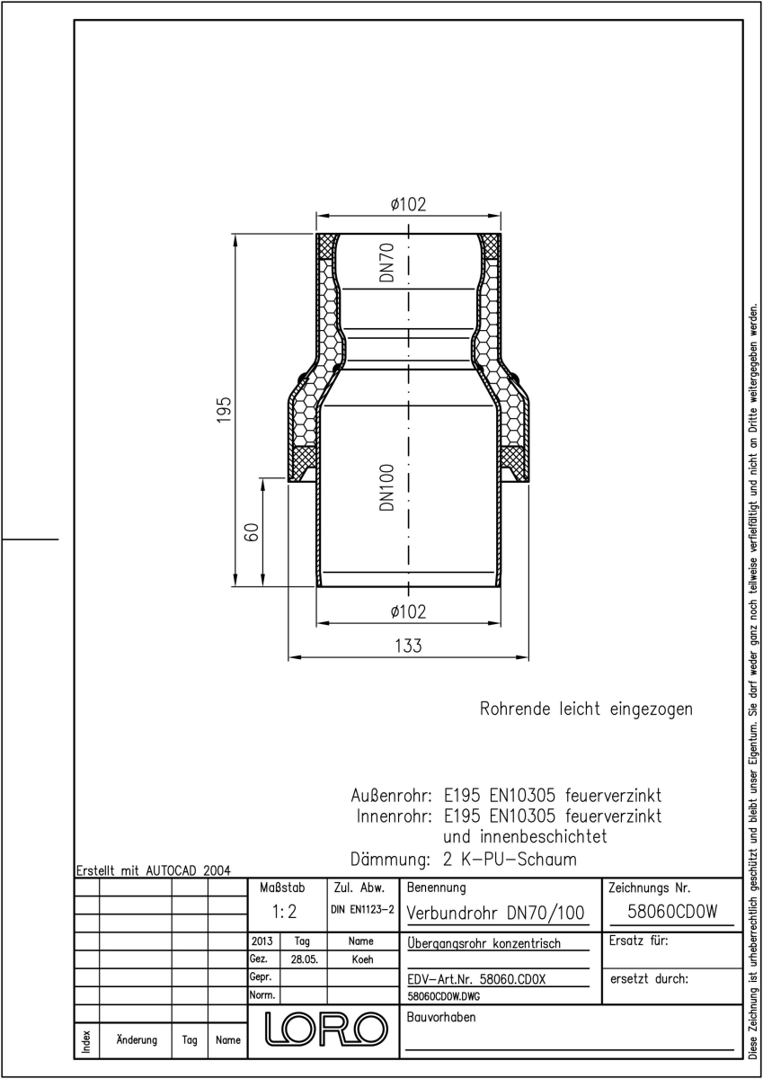 LORO-X Verbundrohr Übergangsrohr (konzentr. Red.-Stück) bestehend aus Innenrohr (LORO-X Rohr, aus Stahl, feuerverzinkt, nach DIN EN 1123, mit erhöhtem Qualitätsstandard gemäß RAL-Gütezeichen GZ-694, mit 2-Kammern-Steckmuffenverbindung, Baustoffklasse A1, formstabil, bruchfest, rückstausicher, langlebige Innenbeschichtung gemäß DIN EN ISO 2178 auf Basis einer 2K-Epoxid-Kombination, Farbton: Rotbraun), Dämmschicht (PU-Hartschaum B2, FCKW-frei) und Außenrohr (LORO-X Rohr, feuerverzinkt), DN 70/100