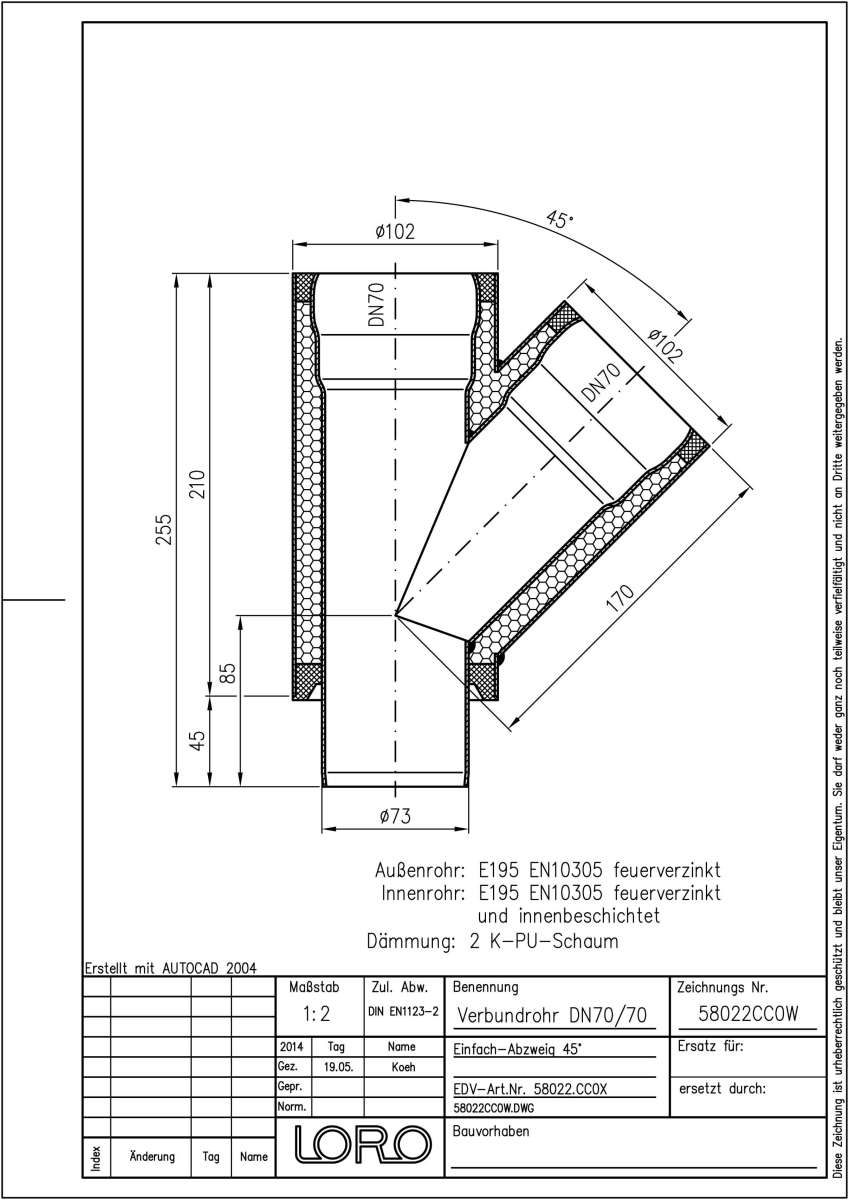 LORO-X Verbundrohr-Abzweig, bestehend aus Innenrohr (LORO-X Rohr, aus Stahl feuerverzinkt, nach DIN EN 1123, mit erhöhtem Qualitätsstandard gemäß RAL-Gütezeichen GZ-694, mit 2-Kammern-Steckmuffenverbindung, Baustoffklasse A1, formstabil, bruchfest, rückstausicher, langlebige Innenbeschichtung gemäß DIN EN ISO 2178 auf Basis einer 2K-Epoxid-Kombination, Farbton: Rotbraun), Dämmschicht (PU-Hartschaum B2, FCKW-frei) und Außenrohr (LORO-X Rohr, aus Stahl, feuerverzinkt), 45 Grad, DN 70