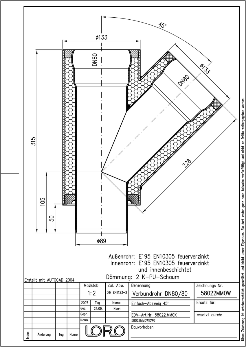 LORO-X Verbundrohr-Abzweig, bestehend aus Innenrohr (LORO-X Rohr, aus Stahl feuerverzinkt, nach DIN EN 1123, mit erhöhtem Qualitätsstandard gemäß RAL-Gütezeichen GZ-694, mit 2-Kammern-Steckmuffenverbindung, Baustoffklasse A1, formstabil, bruchfest, rückstausicher, langlebige Innenbeschichtung gemäß DIN EN ISO 2178 auf Basis einer 2K-Epoxid-Kombination, Farbton: Rotbraun), Dämmschicht (PU-Hartschaum B2, FCKW-frei) und Außenrohr (LORO-X Rohr, aus Stahl, feuerverzinkt), 45 Grad, DN 80