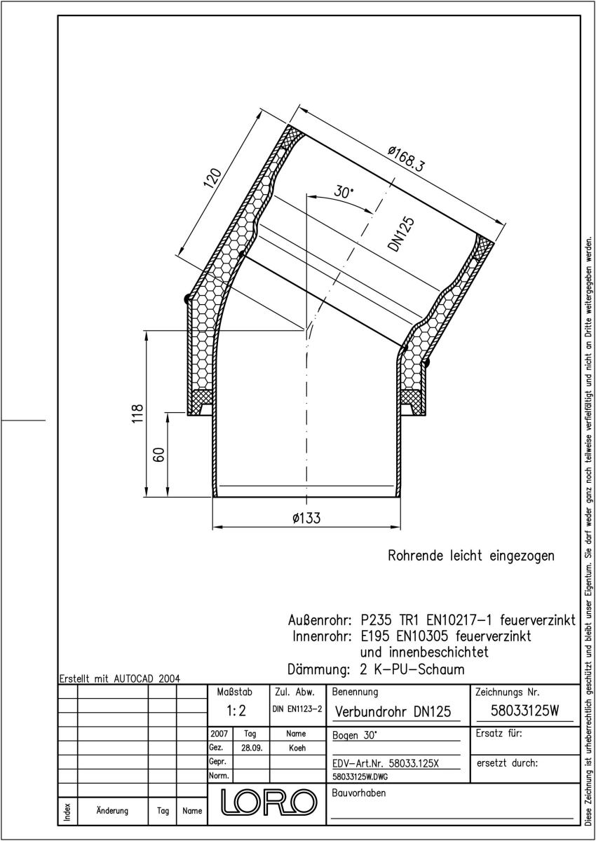 LORO-X Verbundrohr-Bogen, bestehend aus Innenrohr (LORO-X Rohr, aus Stahl, feuerverzinkt, nach DIN EN 1123, mit erhöhtem Qualitätsstandard gemäß RAL-Gütezeichen GZ-694, mit 2-Kammern-Steckmuffenverbindung, Baustoffklasse A1, formstabil, bruchfest, rückstausicher, langlebige Innenbeschichtung gemäß DIN EN ISO 2178 auf Basis einer 2K-Epoxid-Kombination, Farbton: Rotbraun), Dämmschicht (PU-Hartschaum B2, FCKW-frei) und Außenrohr (LORO-X Rohr, feuerverzinkt), 30 Grad, DN 125