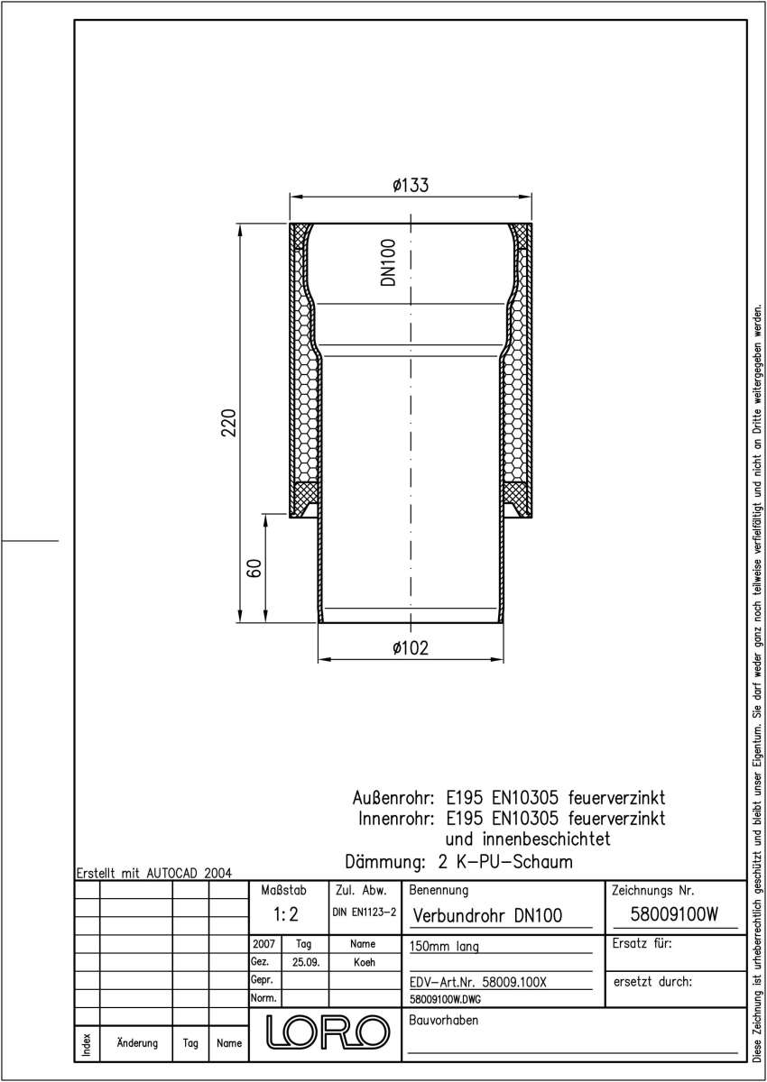 LORO-X Verbundrohr bestehend aus Innenrohr (LORO-X Rohr, aus Stahl feuerverzinkt, nach DIN EN 1123, mit erhöhtem Qualitätsstandard gemäß RAL-Gütezeichen GZ-694, mit 2-Kammern-Steckmuffenverbindung, Baustoffklasse A1, formstabil, bruchfest, rückstausicher, langlebige Innenbeschichtung gemäß DIN EN ISO 2178 auf Basis einer 2K-Epoxid-Kombination, Farbton: Rotbraun), Dämmschicht (PU-Hartschaum B2, FCKW-frei) und Außenrohr (LORO-X Rohr, aus Stahl, feuerverzinkt), 150 mm lang, DN 100