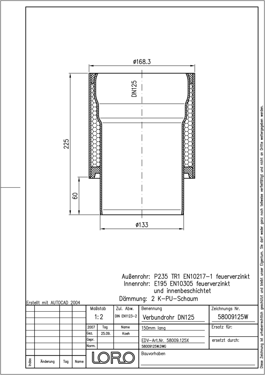 LORO-X Verbundrohr bestehend aus Innenrohr (LORO-X Rohr, aus Stahl feuerverzinkt, nach DIN EN 1123, mit erhöhtem Qualitätsstandard gemäß RAL-Gütezeichen GZ-694, mit 2-Kammern-Steckmuffenverbindung, Baustoffklasse A1, formstabil, bruchfest, rückstausicher, langlebige Innenbeschichtung gemäß DIN EN ISO 2178 auf Basis einer 2K-Epoxid-Kombination, Farbton: Rotbraun), Dämmschicht (PU-Hartschaum B2, FCKW-frei) und Außenrohr (LORO-X Rohr, aus Stahl, feuerverzinkt), 150 mm lang, DN 125
