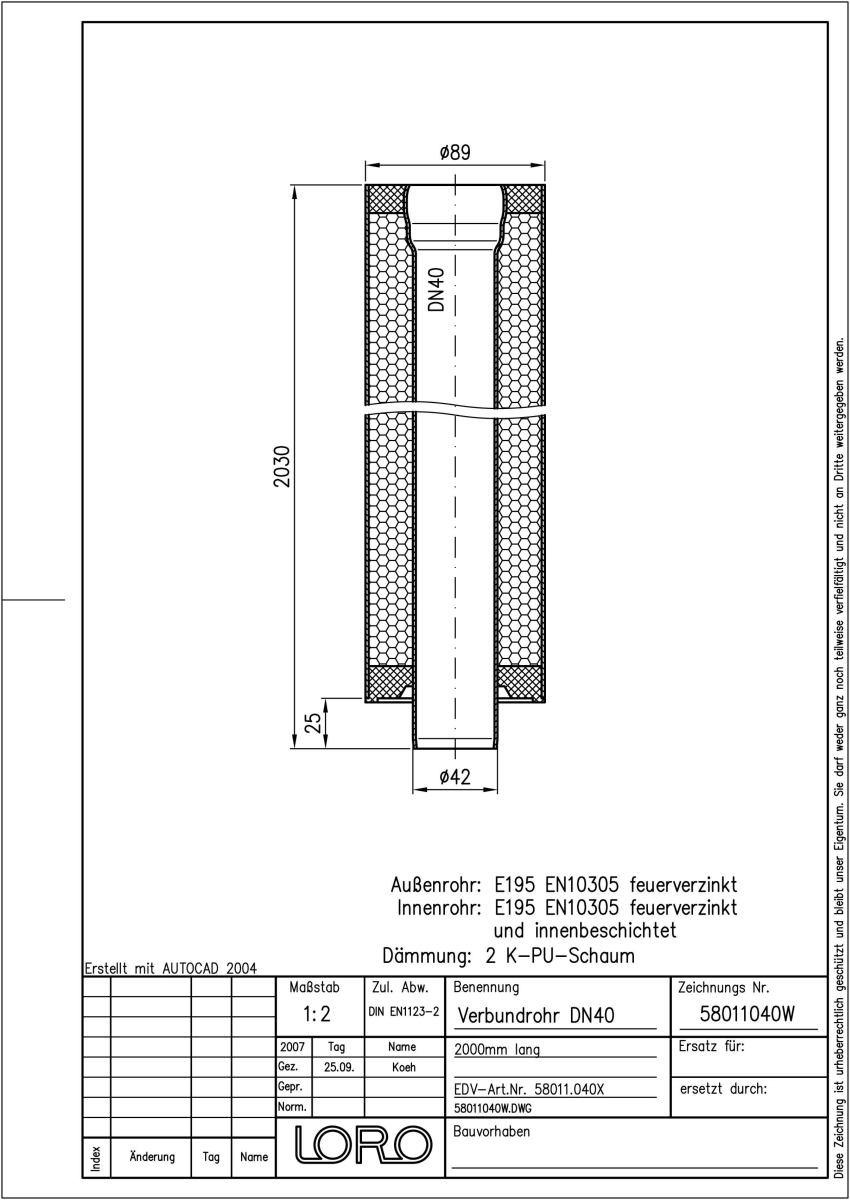 LORO-X Verbundrohr bestehend aus Innenrohr (LORO-X Rohr, aus Stahl feuerverzinkt, nach DIN EN 1123, mit erhöhtem Qualitätsstandard gemäß RAL-Gütezeichen GZ-694, mit 2-Kammern-Steckmuffenverbindung, Baustoffklasse A1, formstabil, bruchfest, rückstausicher, langlebige Innenbeschichtung gemäß DIN EN ISO 2178 auf Basis einer 2K-Epoxid-Kombination, Farbton: Rotbraun), Dämmschicht (PU-Hartschaum B2, FCKW-frei) und Außenrohr (LORO-X Rohr, aus Stahl, feuerverzinkt), 2000 mm lang, DN 40