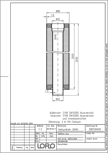 LORO-X Verbundrohr bestehend aus Innenrohr (LORO-X Rohr, aus Stahl feuerverzinkt, nach DIN EN 1123, mit erhöhtem Qualitätsstandard gemäß RAL-Gütezeichen GZ-694, mit 2-Kammern-Steckmuffenverbindung, Baustoffklasse A1, formstabil, bruchfest, rückstausicher, langlebige Innenbeschichtung gemäß DIN EN ISO 2178 auf Basis einer 2K-Epoxid-Kombination, Farbton: Rotbraun), Dämmschicht (PU-Hartschaum B2, FCKW-frei) und Außenrohr (LORO-X Rohr, aus Stahl, feuerverzinkt), 3000 mm lang, DN 40