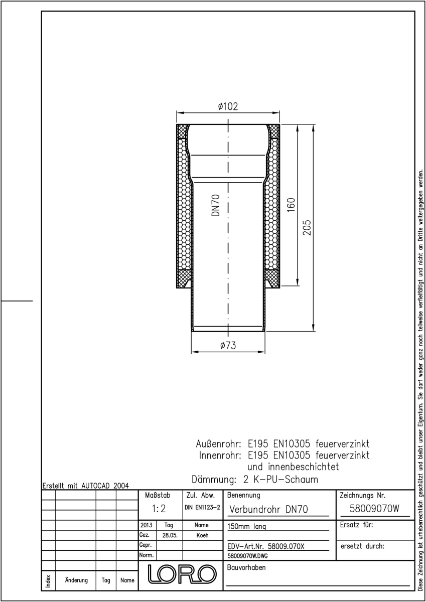 LORO-X Verbundrohr bestehend aus Innenrohr (LORO-X Rohr, aus Stahl feuerverzinkt, nach DIN EN 1123, mit erhöhtem Qualitätsstandard gemäß RAL-Gütezeichen GZ-694, mit 2-Kammern-Steckmuffenverbindung, Baustoffklasse A1, formstabil, bruchfest, rückstausicher, langlebige Innenbeschichtung gemäß DIN EN ISO 2178 auf Basis einer 2K-Epoxid-Kombination, Farbton: Rotbraun), Dämmschicht (PU-Hartschaum B2, FCKW-frei) und Außenrohr (LORO-X Rohr, aus Stahl, feuerverzinkt), 150 mm lang, DN 70
