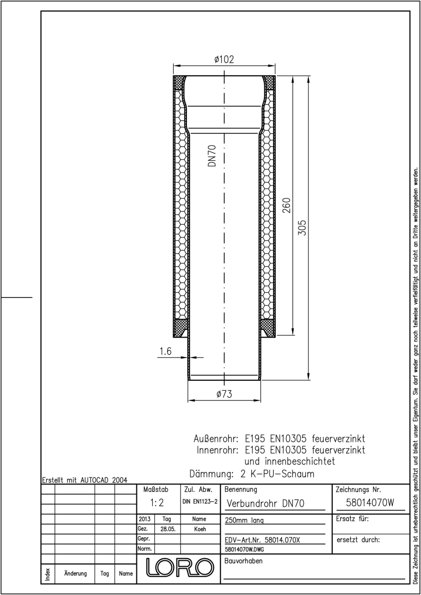 LORO-X Verbundrohr bestehend aus Innenrohr (LORO-X Rohr, aus Stahl feuerverzinkt, nach DIN EN 1123, mit erhöhtem Qualitätsstandard gemäß RAL-Gütezeichen GZ-694, mit 2-Kammern-Steckmuffenverbindung, Baustoffklasse A1, formstabil, bruchfest, rückstausicher, langlebige Innenbeschichtung gemäß DIN EN ISO 2178 auf Basis einer 2K-Epoxid-Kombination, Farbton: Rotbraun), Dämmschicht (PU-Hartschaum B2, FCKW-frei) und Außenrohr (LORO-X Rohr, aus Stahl, feuerverzinkt), 250 mm lang, DN 70