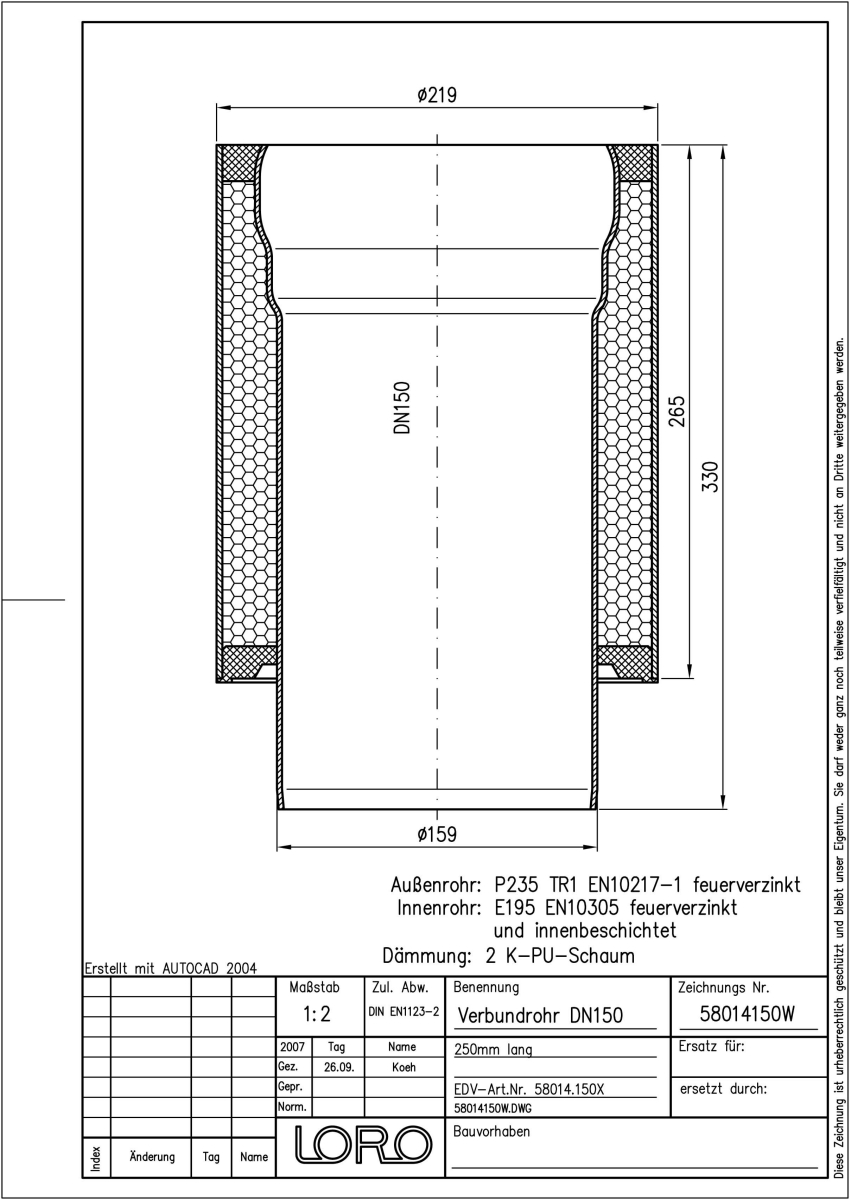 LORO-X Verbundrohr bestehend aus Innenrohr (LORO-X Rohr, aus Stahl feuerverzinkt, nach DIN EN 1123, mit erhöhtem Qualitätsstandard gemäß RAL-Gütezeichen GZ-694, mit 2-Kammern-Steckmuffenverbindung, Baustoffklasse A1, formstabil, bruchfest, rückstausicher, langlebige Innenbeschichtung gemäß DIN EN ISO 2178 auf Basis einer 2K-Epoxid-Kombination, Farbton: Rotbraun), Dämmschicht (PU-Hartschaum B2, FCKW-frei) und Außenrohr (LORO-X Rohr, aus Stahl, feuerverzinkt), 250 mm lang, DN 150