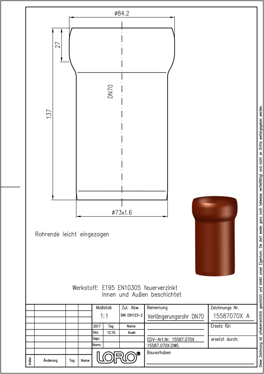 LORO-X Verlängerungsrohr nach DIN EN 1253 mit erhöhtem Qualitätsstandard gemäß RAL-Gütezeichen,, aus Stahl, feuerverzinkt, langlebige Außenbeschichtung gemäß DIN EN ISO 2178 auf Basis einer 2K-Epoxid-Kombination, Farbton: Rotbraun, DN 70