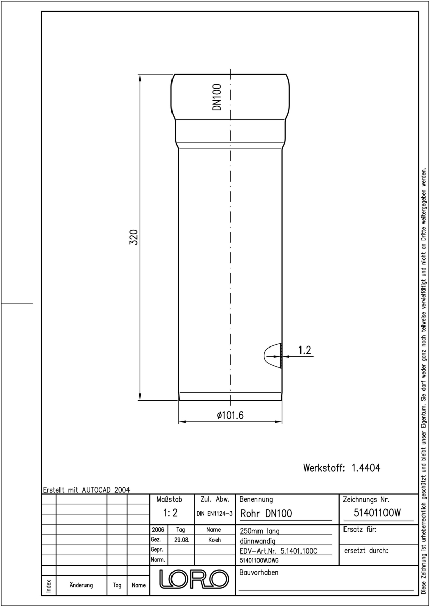 DN 100, 250mm, Steckm., V4A