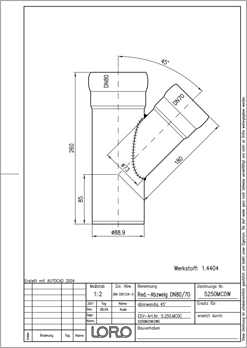 aus Edelstahl Werkstoff Nr. 1.4404 gebeizt und passiviert nach DIN EN 1124 mit erhöhtem Qualitätsstandard mit 2-Kammern-Steckmuffenverbindung Baustoffklasse A1 formstabil bruchfest rückstausicher 45 Grad DN 80/70