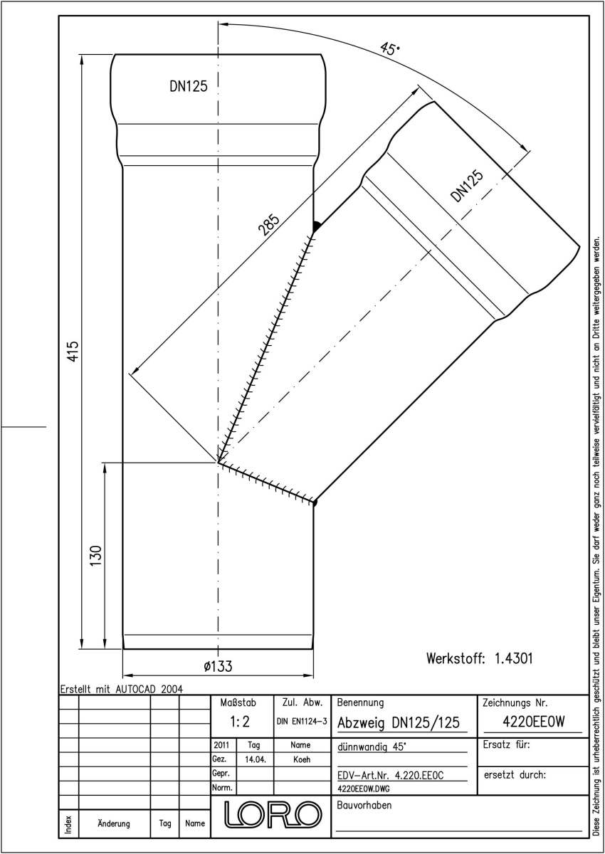 LORO-XCL Abzweig, aus Edelstahl, Werkstoff Nr. 1.4301, gebeizt und passiviert, nach DIN EN 1124 mit erhöhtem Qualitätsstandard gemäß RAL-Gütezeichen GZ-694, mit 2-Kammern-Steckmuffenverbindung, Baustoffklasse A1, formstabil, bruchfest, rückstausicher, 45 Grad, DN 125