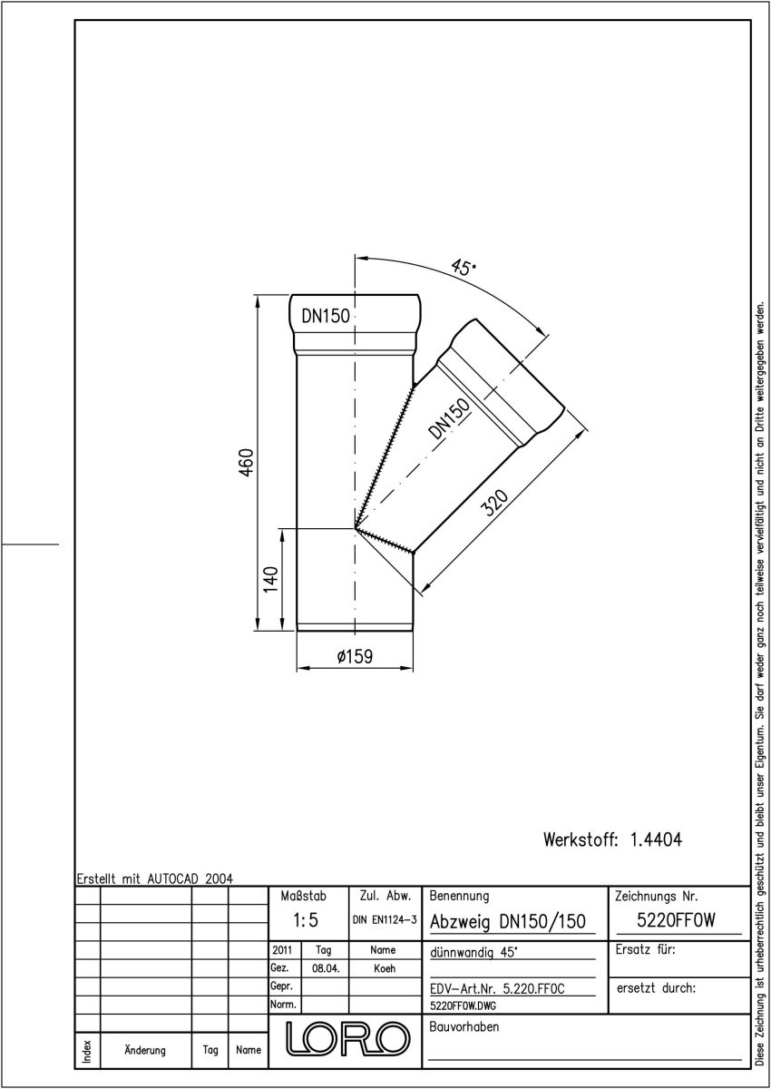 LORO-XCL Abzweig, aus Edelstahl, Werkstoff Nr. 1.4404, gebeizt und passiviert, nach DIN EN 1124 mit erhöhtem Qualitätsstandard gemäß RAL-Gütezeichen GZ-694, mit 2-Kammern-Steckmuffenverbindung, Baustoffklasse A1, formstabil, bruchfest, rückstausicher, 45 Grad, DN 150
