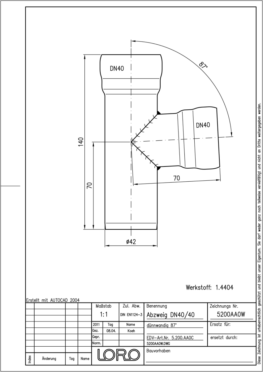 LORO-XCL Abzweig, aus Edelstahl, Werkstoff Nr. 1.4404, gebeizt und passiviert, nach DIN EN 1124 mit erhöhtem Qualitätsstandard gemäß RAL-Gütezeichen GZ-694, mit 2-Kammern-Steckmuffenverbindung, Baustoffklasse A1, formstabil, bruchfest, rückstausicher, 87 Grad, DN 40