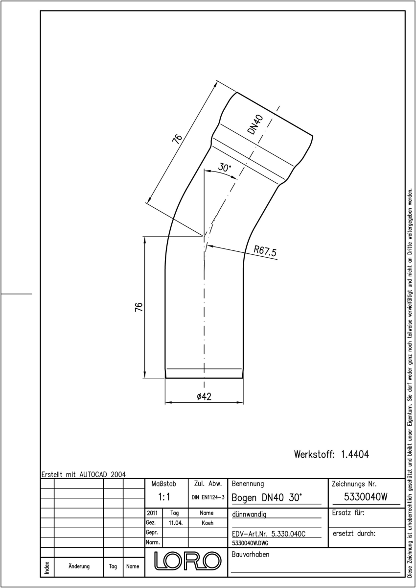 LORO-XCL Bogen, aus Edelstahl, Werkstoff Nr. 1.4404, gebeizt und passiviert, nach DIN EN 1124 mit erhöhtem Qualitätsstandard gemäß RAL-Gütezeichen GZ-694, mit 2-Kammern-Steckmuffenverbindung, Baustoffklasse A1, formstabil, bruchfest, rückstausicher, 30 Grad, DN 40