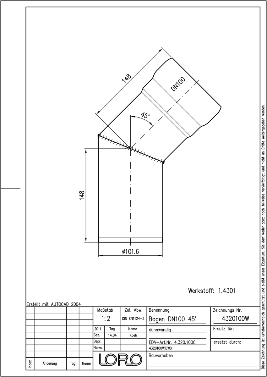 DN 100, 45°, V2A
