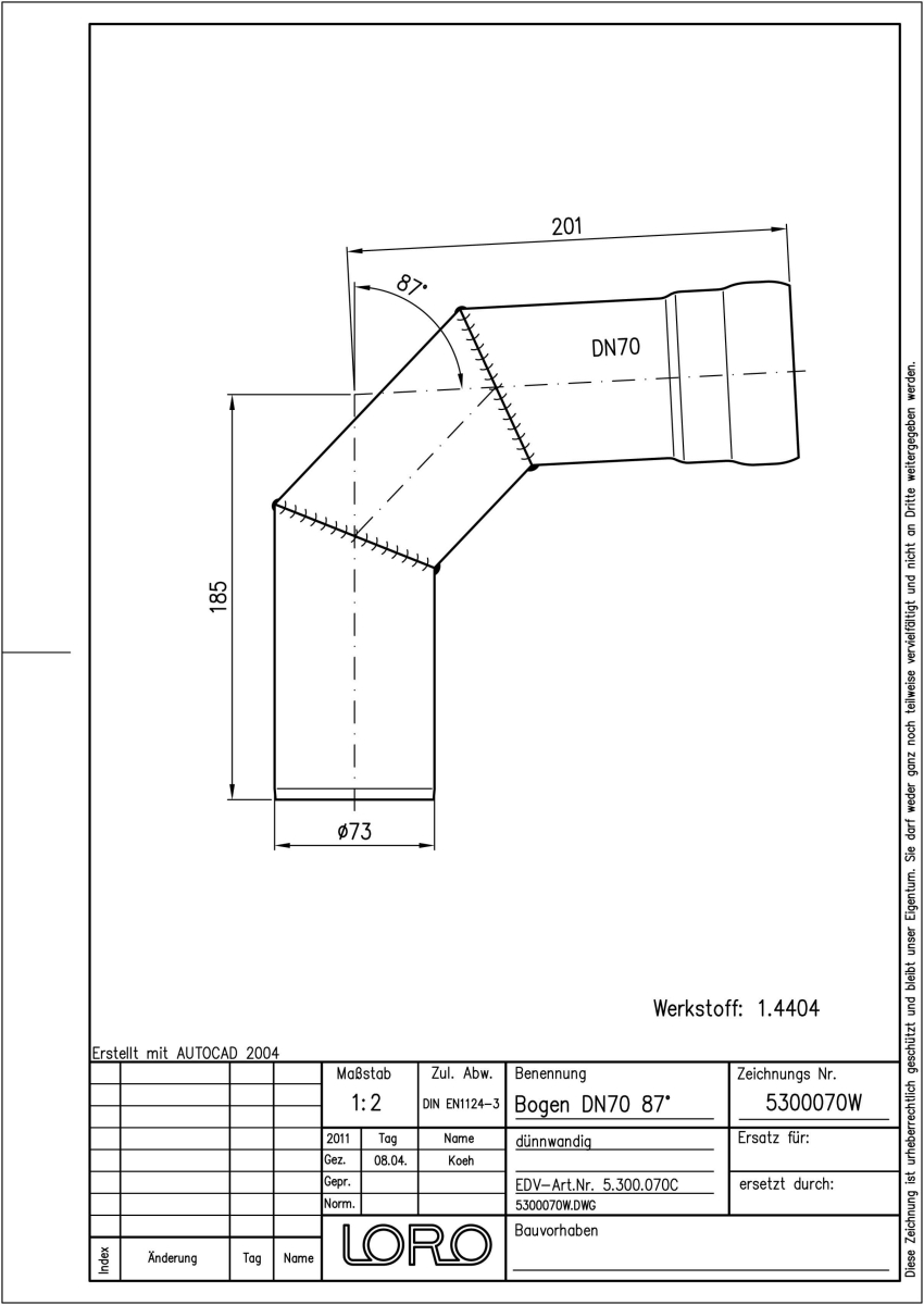 LORO-XCL Bogen, aus Edelstahl, Werkstoff Nr. 1.4404, gebeizt und passiviert, nach DIN EN 1124 mit erhöhtem Qualitätsstandard gemäß RAL-Gütezeichen GZ-694, mit 2-Kammern-Steckmuffenverbindung, Baustoffklasse A1, formstabil, bruchfest, rückstausicher, 87 Grad, DN 70