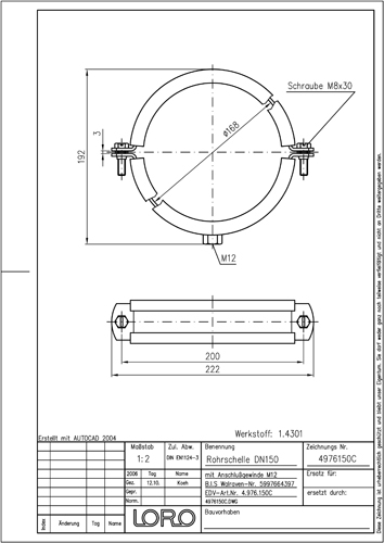 LORO-XCL Rohrschellen mit Anschlussgewinde M 12, rund aus Edelstahl 1.4301, mit Schalldämmung, DN 150