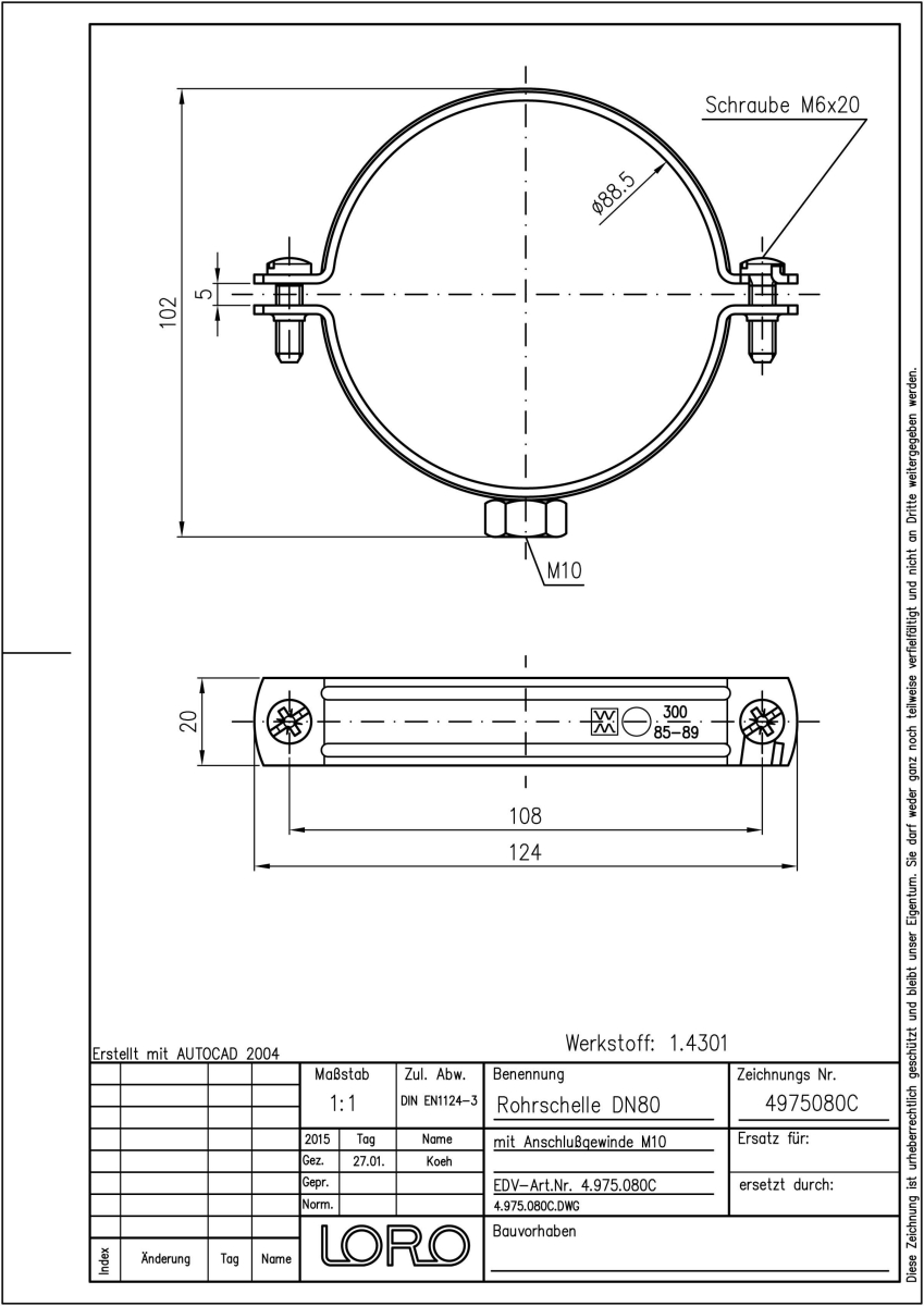 LORO-XCL Rohrschellen mit Kombi Gewinde M 10/12, rund aus Edelstahl 1.4301 , ohne Schalldämmung, DN 80