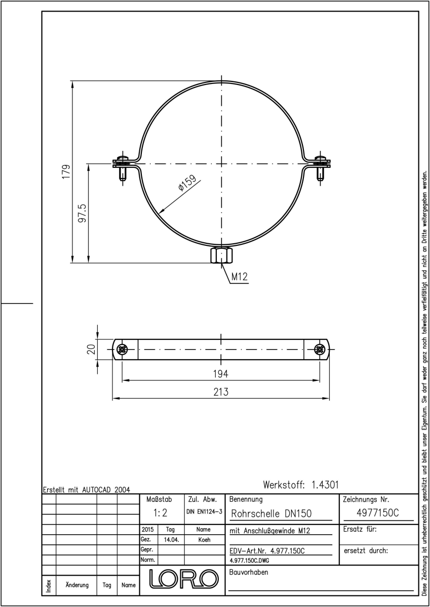 LORO-XCL Rohrschellen mit Anschlussgewinde M 12, rund, aus Edelstahl 1.4301, ohne Schalldämmung, DN 150