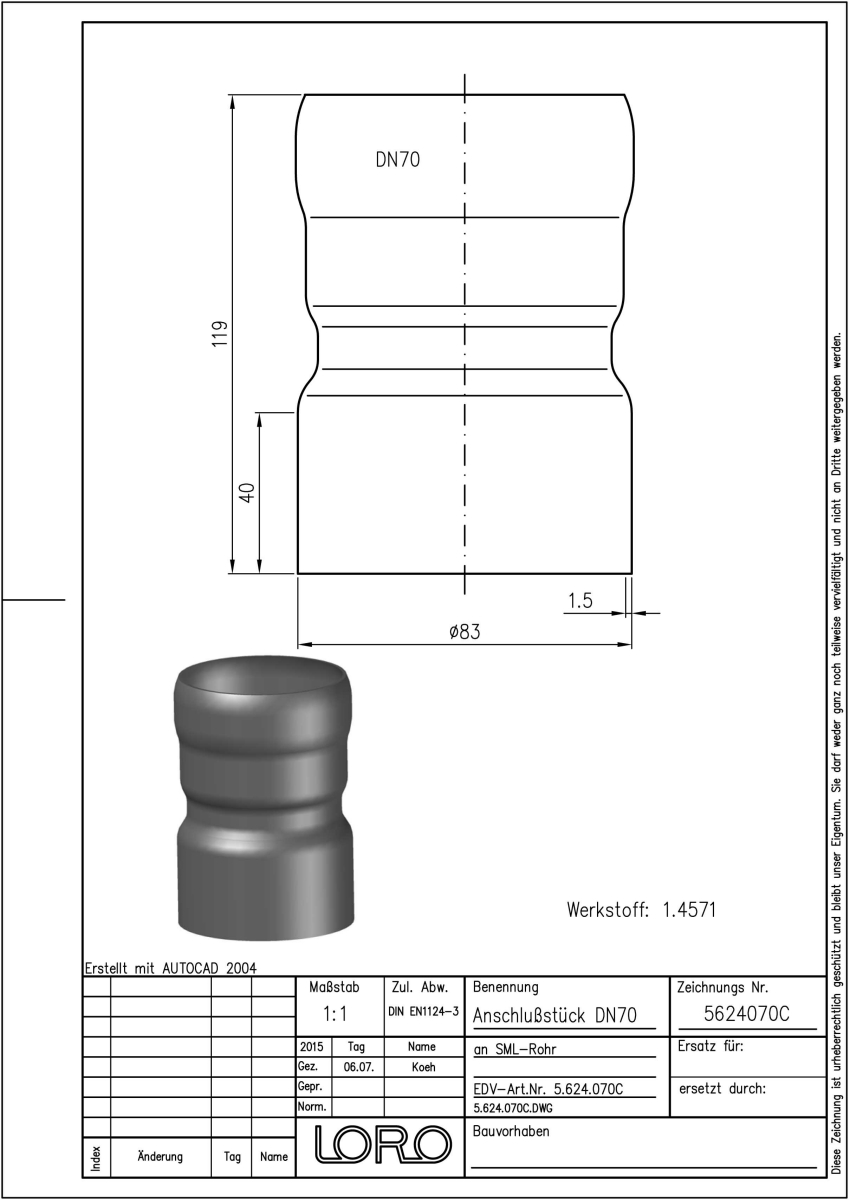 LORO-XCL Anschlussstück, aus Edelstahl, Werkstoff Nr. 1.4571, gebeizt und passiviert, von LORO-XCL Rohr an SML-Rohr, nach DIN EN 1124 mit erhöhtem Qualitätsstandard gemäß RAL-Gütezeichen GZ-694, mit 2-Kammern-Steckmuffenverbindung, Baustoffklasse A1, formstabil, bruchfest, rückstausicher, DN 70/80