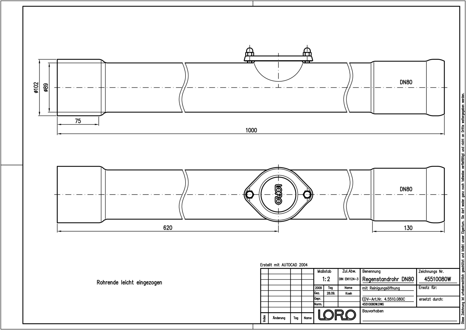 LORO-XCL Regenstandrohr, aus Edelstahl, Werkstoff 1.4571, gebeizt und passiviert, rund, mit Reinigungsöffnung, nach DIN EN 1124 mit erhöhtem Qualitätsstandard gemäß RAL-Gütezeichen GZ-694, mit 2-Kammern-Steckmuffenverbindung, Baustoffklasse A1, formstabil, bruchfest, rückstausicher, 1000 mm, DN 80