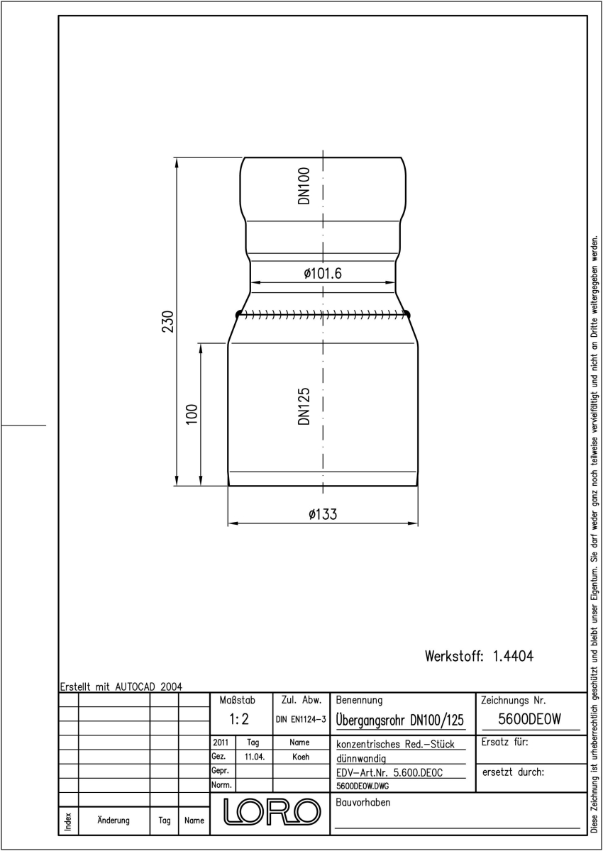 LORO-XCL Übergangsrohr konzentrisch, konzentrisch, aus Edelstahl, Werkstoff Nr. 1.4404, gebeizt und passiviert, nach DIN EN 1124 mit erhöhtem Qualitätsstandard gemäß RAL-Gütezeichen GZ-694, mit 2-Kammern-Steckmuffenverbindung, Baustoffklasse A1, formstabil, bruchfest, rückstausicher, DN 100/125
