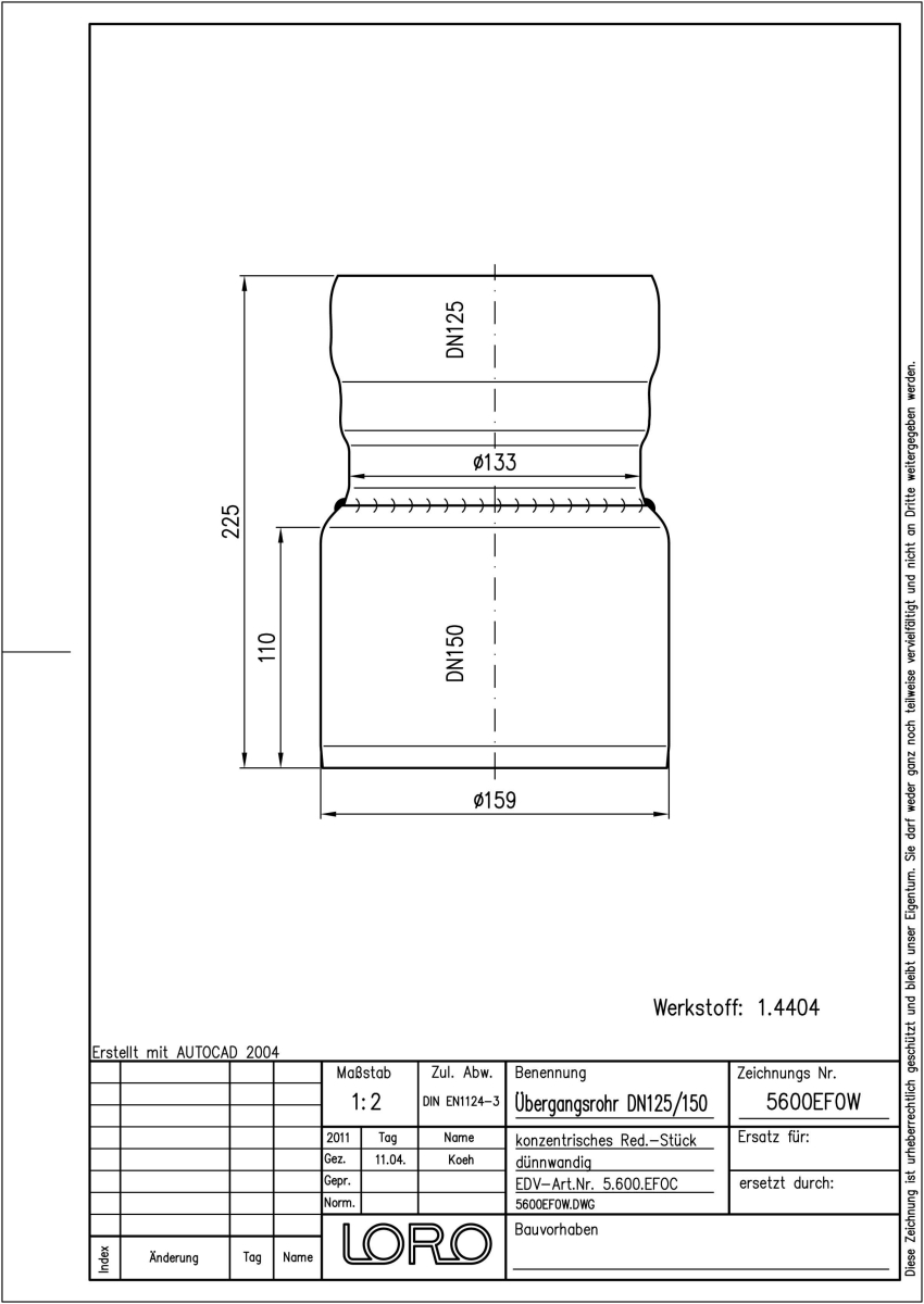LORO-XCL Übergangsrohr konzentrisch, konzentrisch, aus Edelstahl, Werkstoff Nr. 1.4404, gebeizt und passiviert, nach DIN EN 1124 mit erhöhtem Qualitätsstandard gemäß RAL-Gütezeichen GZ-694, mit 2-Kammern-Steckmuffenverbindung, Baustoffklasse A1, formstabil, bruchfest, rückstausicher, DN 125/150