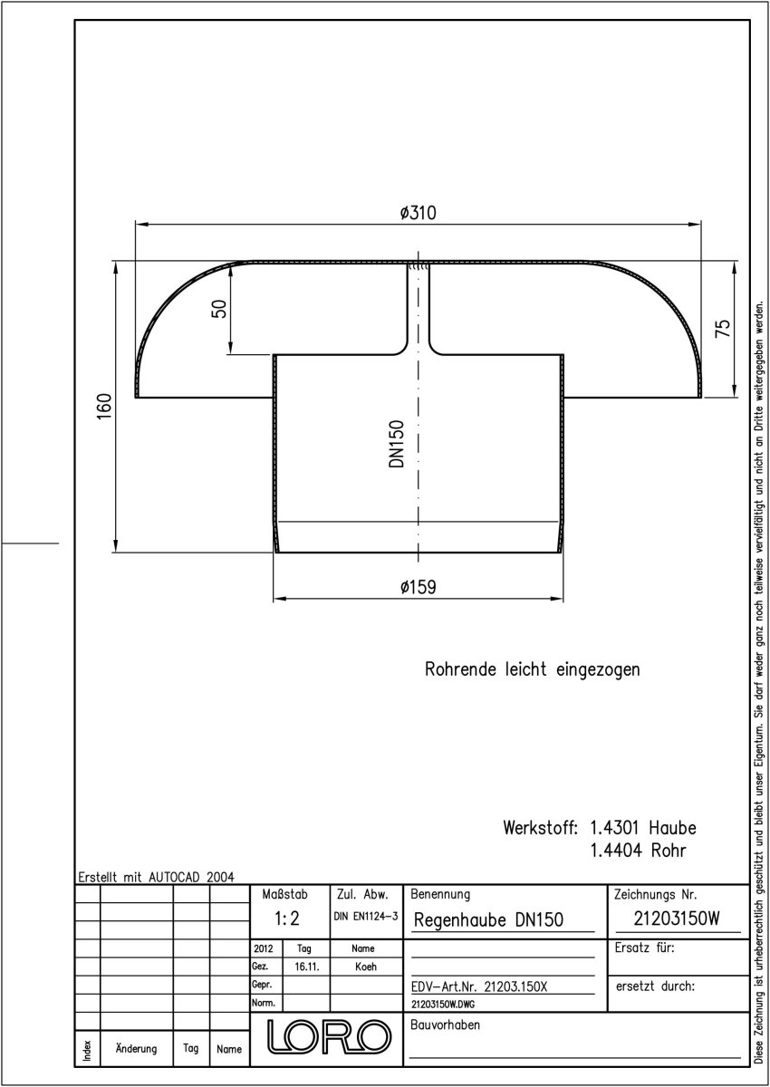 LORO-XC Regenhaube für LORO-X Lüftungsrohre mit Muffe, aus Edelstahl 1.4301, DN 150