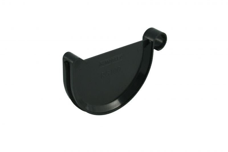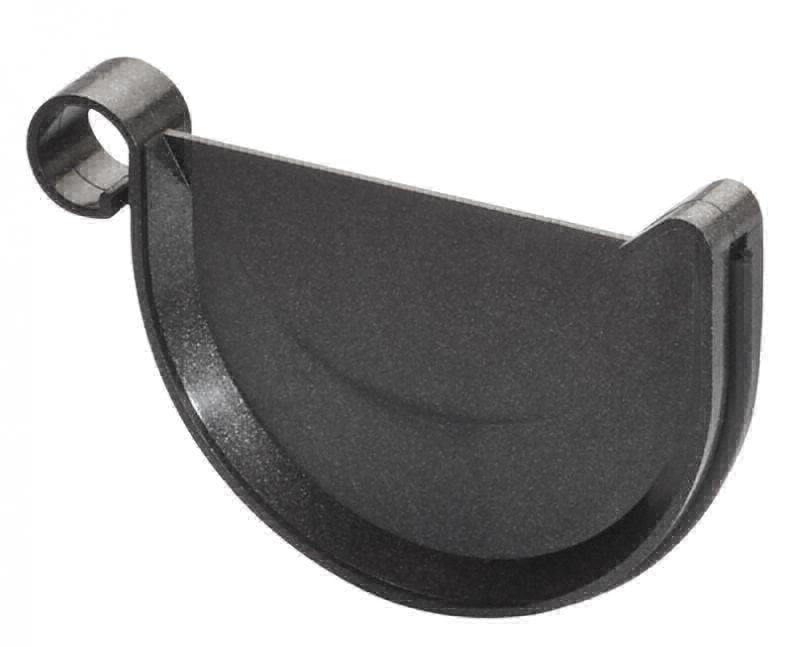 Das Endstück hat eine Dichtung und verschließt durch eine Steckverbindung das Ende einer halbrunden Dachrinne.