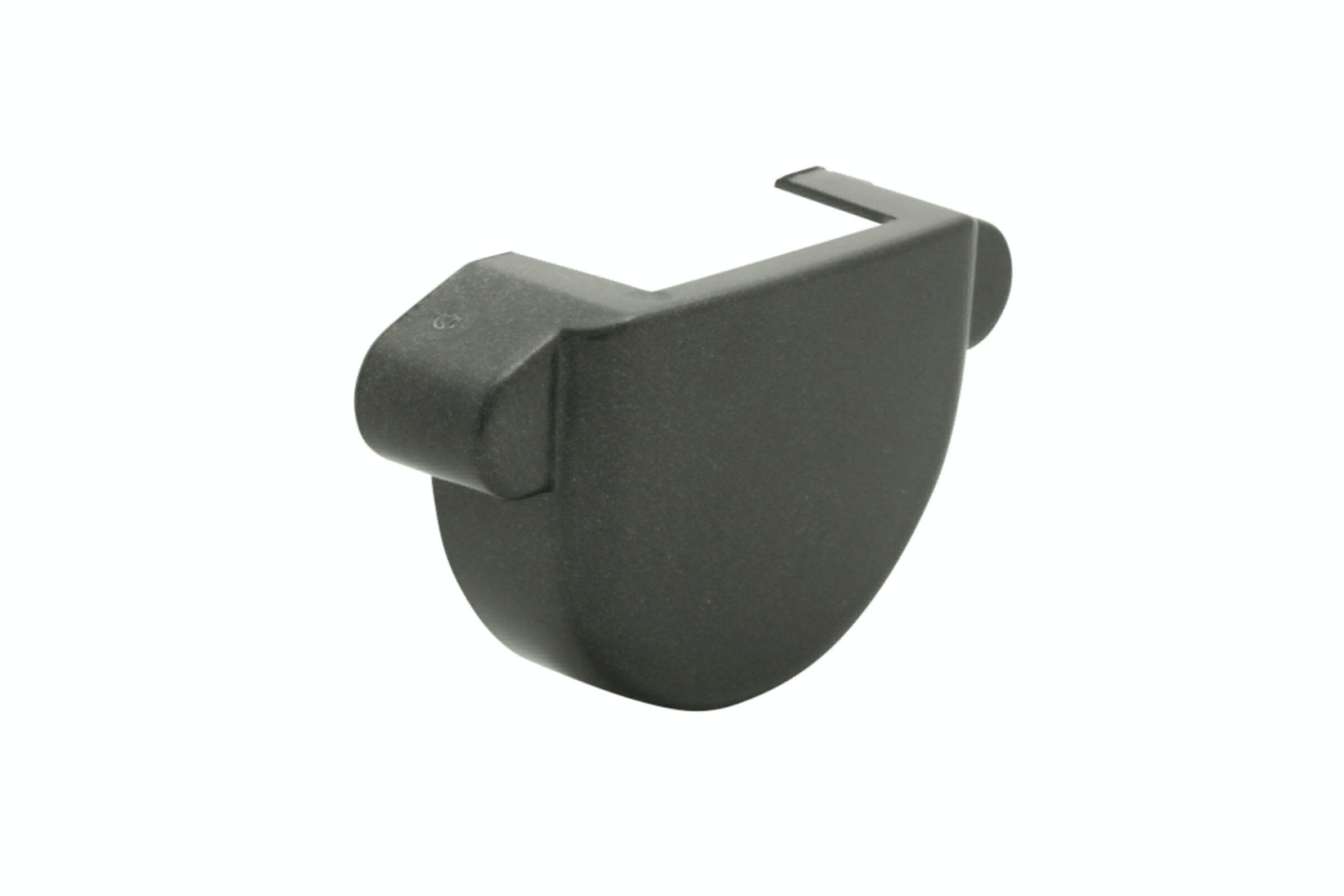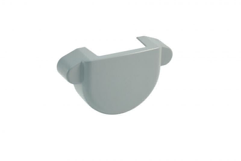 Das Endstück hat eine Dichtung und verschließt durch eine Steckverbindung das Ende einer halbrunden Dachrinne.