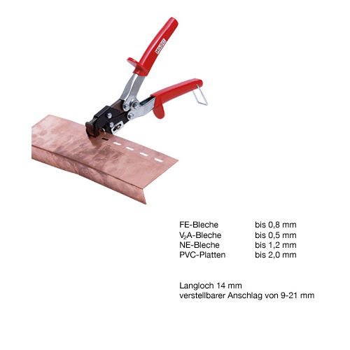 Zum schnellen und einhändigen Stanzen von Langlöchern in Traufblechenm Längsabdeckungen, Winkelanschlüssen usw., die durch Längenausdehnung mit Deckstiften locker abgenagelt werden müssen. Das gestanzte Blech wird durch die Rückholfeder selbständig vom Stempel abgestreift.