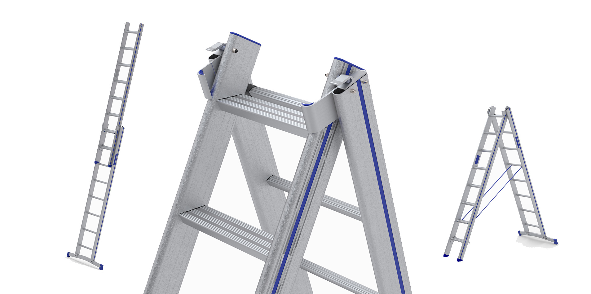- zweiteilige Hybrid-Leiter: Stehleiter, Anlegeleiter und Scheibeleiter in einem
