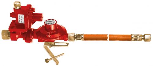 Anschluss an 1 x 33 kg-Propanflasche - Außenanlage für Niederdruckbereich 50 mbar - Bestehend aus Niederdruckregeler mit Sicherheitsabsperrventil mit Sichtanzeige, Leckgas-Sicherheitsablassventil, 400 mm-Schlauch und Zubehör